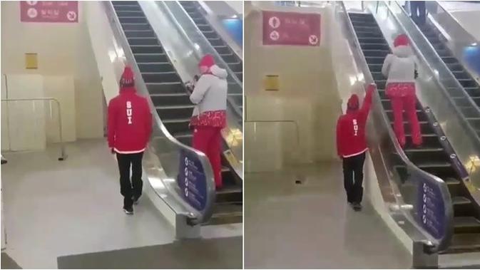 Pada video yang diunggah di Instagram pada mulanya terlihat dua orang pria yang memakai jaket berwarma merah dan abu berdiri di depan eskalator. Keduanya memang terlihat biasa saja, akan tetapi salah seorang yang memakai jaket merah justru berdiri di bagian luar eskaltor.