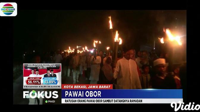 Fokus, Bekasi - Pawai obor menyambut datangnya bulan Ramadan dilakukan ratusan orang di Kampung Pintu Air, Medan Satria, Kota Bekasi, Jawa Barat, Sabtu malam.