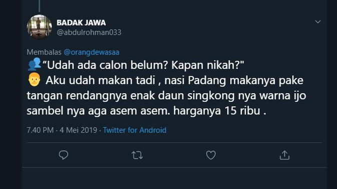 Apalagi pertanyaan yang lebih spesifik adalah pertanyaan tentang asmara, seperti "Udah ada calon belum? Kapan nikah?" adalah pertanyaan yang kerap ditanyakan di hari Lebaran. Siapkah kamu dengan jawaban ngelesmu? Berikut Liputan6.com merangkum jawaban ngeles saat lebaran dari @orangdewasaa, Kamis (6/6/2019).