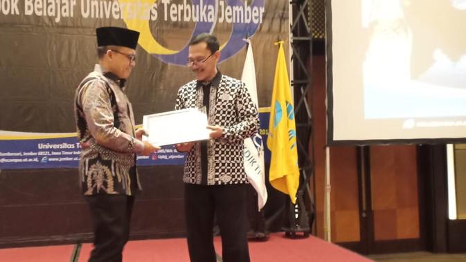 Penghargaan tersebut diberikan langsung Direktur UT Jember, Prof. DR. Mohammad Imam Farizi, MPd kepada Bupati Anas di Banyuwangi, Sabtu malam (6/7/2019) dalam acara rapat koordinasi & pembekalan pengurus kelompok belajar UT. UT - Jember adalah bagian dari UT yang merupakan Perguruan Tinggi Negeri (PTN) ke-45 di Indonesia yang menerapkan sistem belajar terbuka dan jarak jauh.