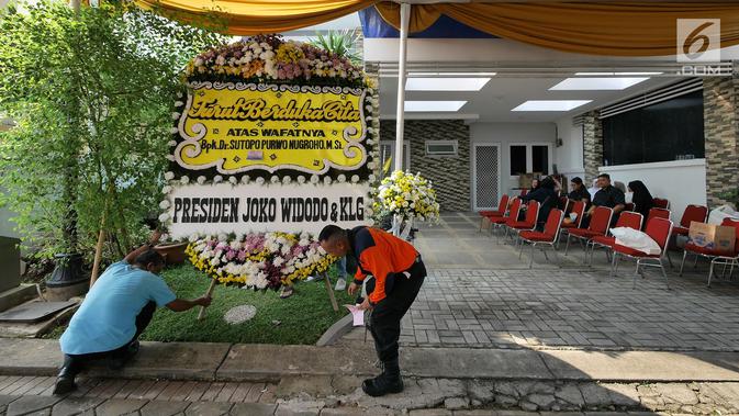 Sejumlah karangan bunga menghiasi rumah duka almarhum Kepala Pusat Data Informasi dan Humas BNPB Sutopo Purwo Nugroho terlihat di rumah duka Raffles Hils, Cimanggis, Depok, Jawa Barat, Minggu (7/7/2019). Sutopo meninggal di Guang Zhou China. (Liputan6.com/Herman Zakharia)