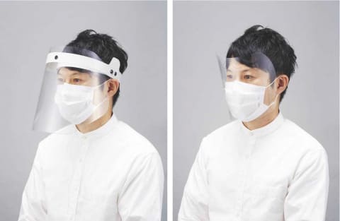 簡易フェイスシールドは、レールクリヤーホルダーにも使用されている、透明性が高く耐久性にも優れたPET製シートを採用。ヘッドギアタイプとマスク装着タイプの2種類を用意し、ヘッドギアタイプは、シールドを上下に動かせ、不要なときには跳ね上げておける。なお、ヘッドギアタイプ交換用のフェイスシールドは25枚入り3,000円。