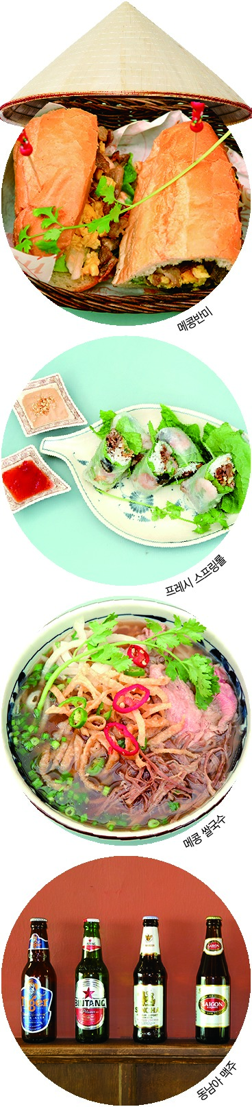 '퍼(Pho)'라 불리는 베트남의 대표 음식. 쌀가루를 불려서 약하게 달구어진 판 위에 빈대떡처럼 얇게 펴 말리다가 약간 마르면 떼어내 칼국수보다 가늘게 썬다. 숙주·칠리고추·고수·라임·양파·고기 등이 들어가 독특한 향과 맛이 난다. 소화가 잘 되고 영양성분이 고르게 들어 있는 데다가 칼로리가 적어 건강음식으로 알려져 있다. 메콩쌀국수는 진한 소고기 육수에 양지와 목살이 듬뿍 올라가 있는데 고기는 처음에 살짝 덜 익어서 나오지만 국물에 섞어주면 금세 익는다. 짜지 않고 담백한 국물 한 숟가락이면 속이 개운하다. 쌀국수에는 고수를 얹어 나오는데 주문할 때 빼달라거나 추가할 수 있다.