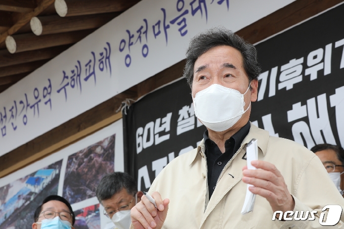 (구례=뉴스1) 황희규 기자 = 이낙연 더불어민주당 대표가 19일 오후 전남 구례군 양정마을을 찾아 호우피해를 입은 한우사육농가 농민들과 대화를 나누고 있다. 2020.9.19/뉴스1