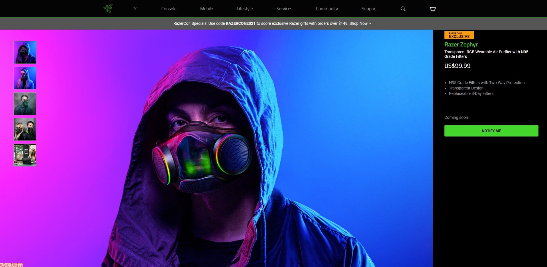 Razer Zephyrは、交換式のN95グレードのフィルターとファン、そしてRazer製品でおなじみのLEDライティングを内蔵したマスク。価格は72時間有効なフィルター3枚(つまり9日分)がついたベースモデルが99.99ドル。99日分のフィルターがついたスターターパックが149.99ドル。交換用フィルター単体の販売も行われ、こちらは10枚で29.99ドルとなる。