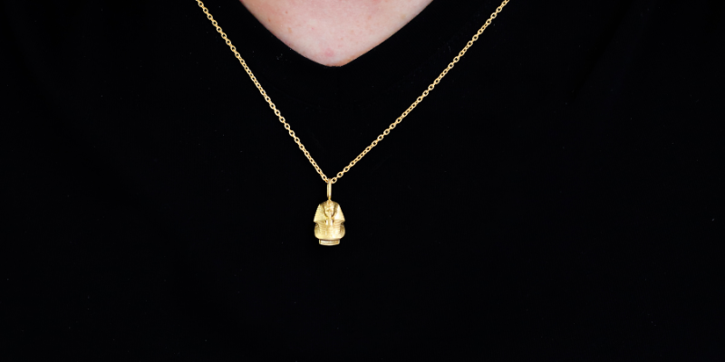 純金のツタンカーメンのマスクをいつも身に着けてパワーをもらえるよう、ペンダント仕様もご用意しました。