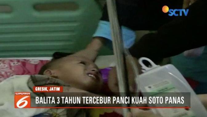 Liputan6.com, Gresik - Seorang balita berusia 3 tahun di Gresik, Jawa Timur, menderita luka bakar setelah tercebur di panci berisi kuah soto panas. Korban menderita luka bakar mencapai 18 persen.