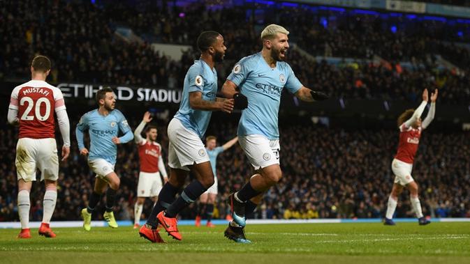 Manchester - Manchester City menang 3-1 atas Arsenal pada laga pekan ke-25 Premier League, di Stadion Etihad, Minggu (3/2/2019). Sergio Aguero menjadi bintang kemenangan City dengan mencetak tiga gol.