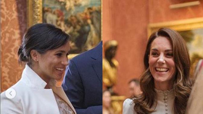 Gaya rambut yang melengkapi penampilan mereka nampak berbeda. Meghan memilih mengikat rambutnya dengan rapi seperti sanggul kecil. Sedangkan, Kate tampil menawan dengan menggerai rambut gelombangnya menghiasi pundak.
