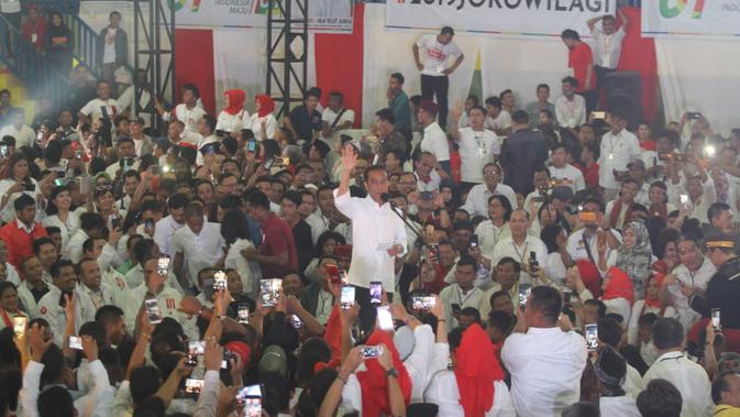 Liputan6.com, Medan - Capres nomor urut 01 Joko Widodo atau Jokowi bersilaturahmi dengan pendukungnya sekaligus kampanye di Gedung Olah Raga (GOR) Jalan Pancing/Williem Iskandar, Kabupaten Deli Serdang, Sumatera Utara (Sumut) Jumat malam (5/4/2019). Dia pun menargetkan perolehan suara di Sumut pada Pilpres 2019 lebih besar dari tahun 2014.