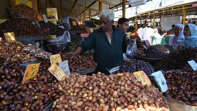 Aktivitas jual beli kurma sebagai persiapan untuk bulan suci Ramadan di sebuah pasar grosir di Karachi, Pakistan pada 5 Mei 2019. Buah khas Timur Tengah, kurma, selama Bulan Ramadan ramai diburu untuk dihidangkan saat berbuka puasa. (AP Photo/Fareed Khan)