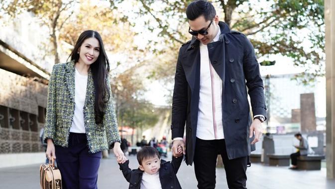 Sedangkan, Harvey dan Raphael kompak mengenakan kaus putih berkarakter dibalut dengan outer denim dan celana jeans. Ayah dan anak ini tampak keren dengan memakai sepatu dari Nike Cortez.