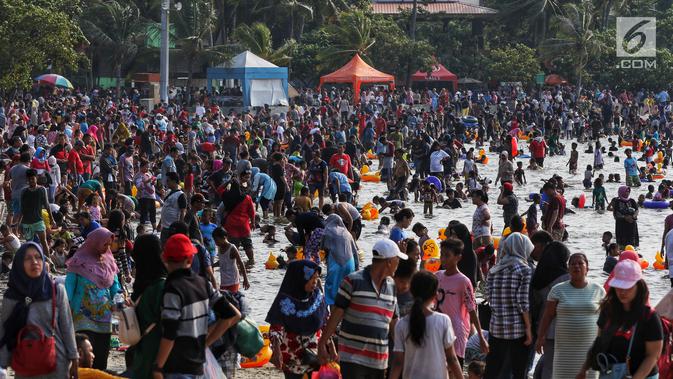 Sejumlah warga menikmati suasana libur Idul Fitri 1440 H dengan memadati kawasan Beach Pool, Taman Impian Jaya Ancol, Jakarta, Kamis (6/6/2019). Hari kedua Lebaran banyak dimanfaatkan warga untuk berlibur dan berekreasi bersama keluarga atau kerabat dengan mengunjungi pantai Ancol. (Liputan6.com/Joh
