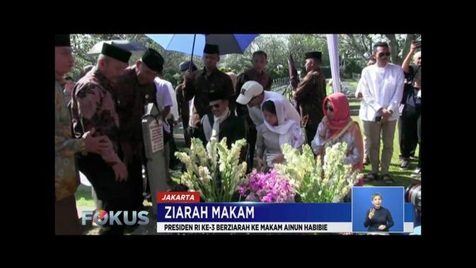 Fokus, Jakarta - Sejumlah warga berziarah ke makam keluarga pada hari pertama Lebaran. Tak terkecuali Presiden ke-3 RI BJ Habibie. Mengisi hari pertama Lebaran, dia berziarah ke makam istrinya Ainun Habibie di TMP Kalibata, Jakarta Selatan.