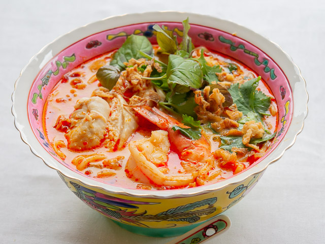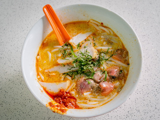 海鮮出汁ベースでとココナッツミルクたっぷりのスープが濃厚で、中華麺によく絡みます。アサリの食感がチュルっと、フィッシュケーキはプリッと。このアサリを使うところが、このお店ならでは。海鮮出汁にアサリの旨味が加わって、濃厚ながらもすっきりした味わいです。