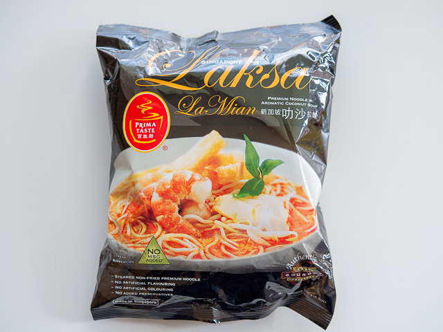 さて、定番のラクサは、エビなどで出汁をとって作るココナッツミルクたっぷりのスープに中華麺、そこに海老、つみれ(かまぼこ)などを乗せます。スーパーマーケットで売っている袋入りのインスタントラクサのパッケージにも、確かにそのような具が乗っています。このPrima Tasteのラクサは2.26シンガポールドルで約180円でした(販売店によって価格差があります)。