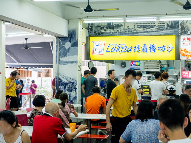 アラブ人街とインド人街の間にある、「Sungei Road Laksa (スンゲイ ロード ラクサ)」に出かけました。スンゲイ ロードという通りの近くですが、実際には タウンシェンド ロードにあります。いくつかのお店が入っている小さめのホーカーズの中の、黄色の看板が鮮やかなお店です。日曜日の午後1時ごろでしたが、このお店には30人くらいの列ができていました。