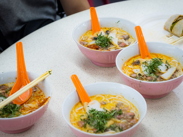 ピンクのボールを一つ手に取って、入っている麺にスープをかけて麺をほぐして、もう一度丁寧にスープをかけたら隣のカウンターへ。そこで具を乗せたら出来上がりです。フィッシュケーキ(かまぼこ)に生に近いアサリをたくさん、香草を振ります。ボールの縁に、サンバルというチリを添えて出来上がりです。
