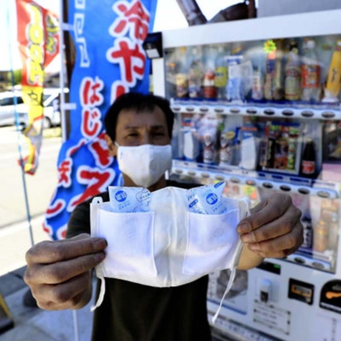 自販機内で冷やされ、マスクの内側には保冷剤が差し込める「冷やしマスク」(14日午前、山形県山辺町で)=武藤要撮影