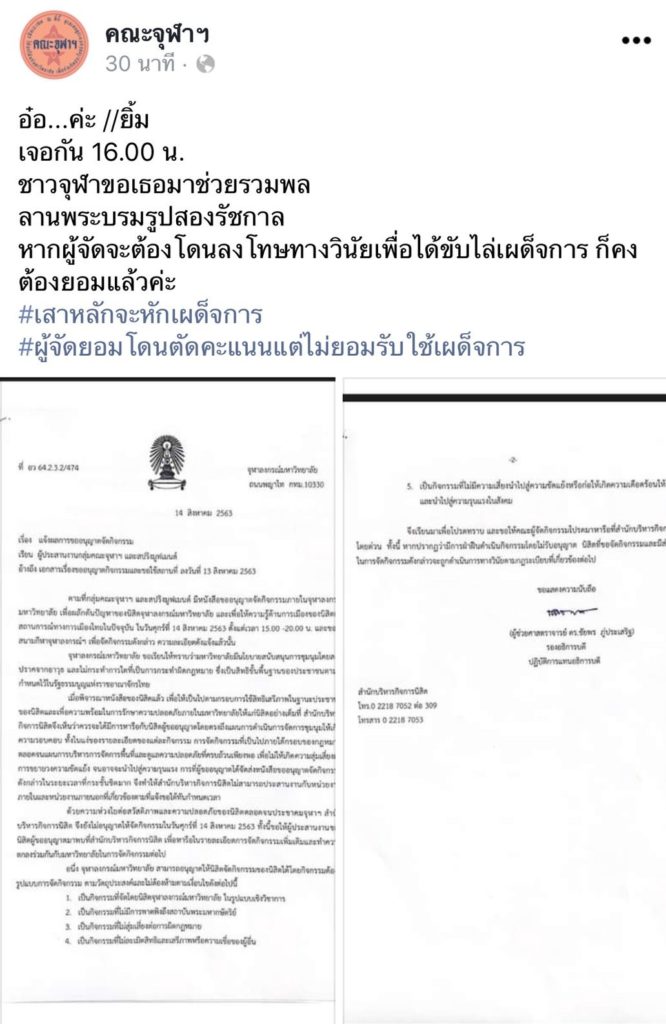 คลิกอ่าน ด่วน! จุฬาฯเบรกนิสิตจัดชุมนุมวันนี้ พร้อมขู่ลงดาบคนฝ่าฝืน