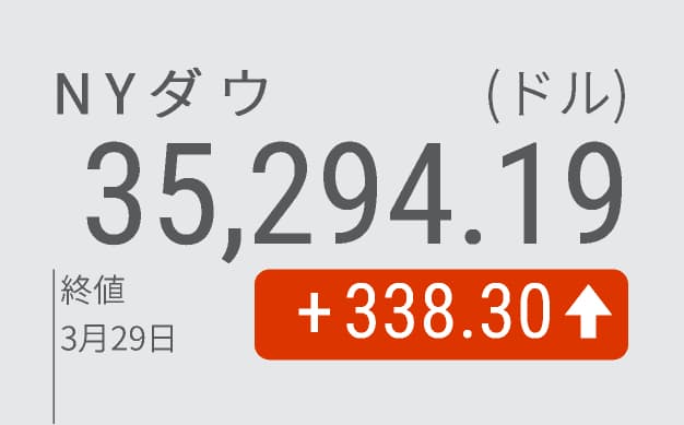 【NQNニューヨーク=戸部実華】29日の米株式市場でダウ工業株30種平均は4日続伸し、前日比338ドル30セント(1.0%)高の3万5294ドル19セントで終えた。3万5000ドル台を回復するのは2月10日以来。ロシア国防省が29日、ウクライナの首都キエフなどで軍事活動を縮小すると発表した。停戦交渉の進展を期待し、幅広い銘柄が買われた。米原油先物が続落し、ガソリン高が消費を冷やすとの懸念が和らいだことも株買いを後押しした。