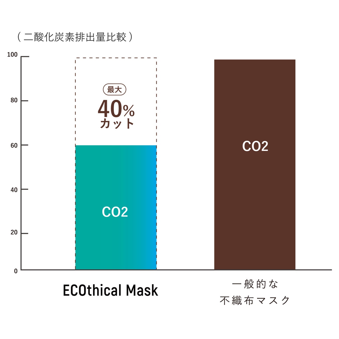 そんな中、原料のほとんどがプラスチックであるマスクの使用により、CO2の排出は大幅に増え続けています。 ECOthical Maskは、製造・焼却の観点で、一般的な不織布と比較し、CO2の排出を大幅にカットすることで2050年までのカーボンニュートラルの実現を目指します。