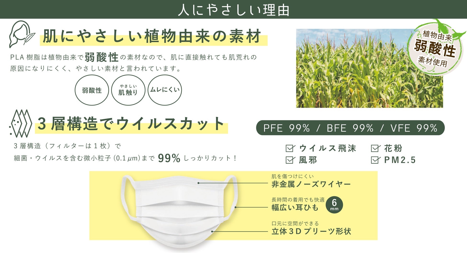 PLA樹脂(ポリ乳酸)は植物由来の原料から作られた、素肌に近い「弱酸性」の素材です。
