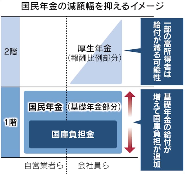 国民年金のスライド終了を前倒しする代わりに厚生年金の報酬比例部分へのスライド適用の終了を延長して帳尻を合わせます。将来にわたる基礎年金の給付が予定より増えると、基礎年金の財源の半分を占める国庫負担が膨らむことになります。累計で数兆円の国庫負担が新たに必要となるとも推計されています。