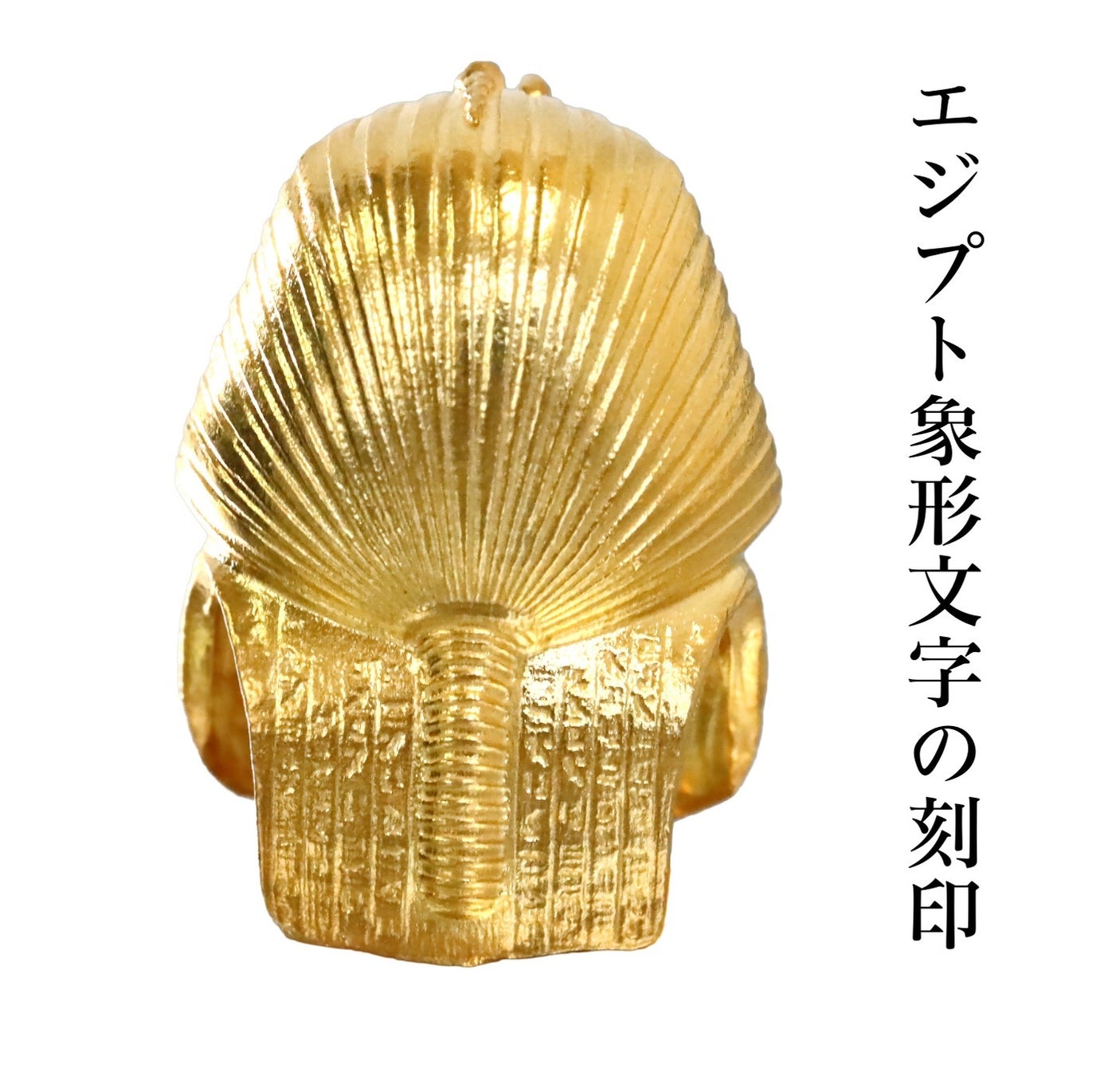 マスクの背面と肩部分にはエジプト象形文字(en)で、縦10行と横2行にわたって刻印されています。こちらも細かく表現しました。(1g、3g、5gは文字が細かすぎて見えません。予めご了承ください)
