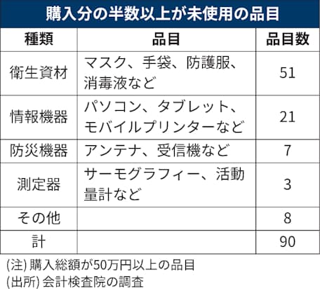 このうち4県48市町村の計55事業で、購入量の半数以上が使われていないケースがあり、22年度末時点で90品目に上った。未使用分の購入額は6億3398万円(国庫負担4億8465万円)だった。